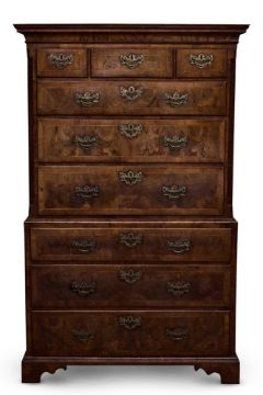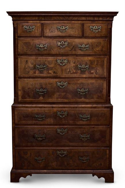 A GEORGE II FIGURED WALNUT AND FEATHERBANDED TALLBOY CIRCA 1730 The cavetto cornice above three short and six graduated long drawers, the upper section with fluted canted angles, on shaped bracket feet, the metalwork apparently original 171cm high, 104cm wide, 54cm deep Condition Report: Marks, knocks, scratches, abrasions consistent with age and use Some chips and losses to veneers and mouldings, one section of the upper cornice has a loss to one front corner, also some opening to the opposite corner joint, some further losses to the sides of the cornice, one larger section of loss to the side veneers also - the sides have latteral 'cut' marks through the top section - possibly from previous removal, there is a butterfly veneer repair in this area As catalogued the locks and handles appear to be original, Please see additional images for visual reference to condition Condition Report Disclaimer