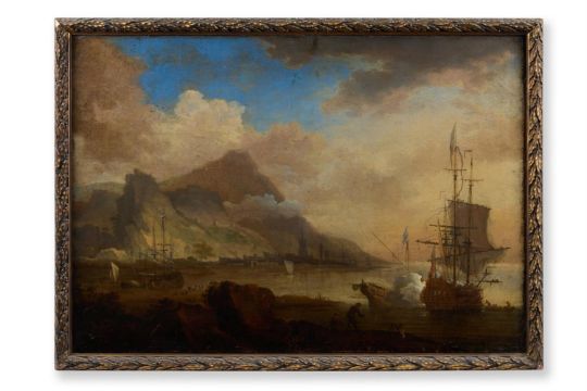 ADRIAEN VAN DIEST (DUTCH 1655-1704) A MOUNTAINOUS COASTAL LANDSCAPE WITH BRITISH MAN-O-WAR FIRING AT ANOTHER VESSEL oil on canvas signed AV DIEST (lower left) 64 x 92cm (25 x 36 in.)This work was bought upon the completion of the Dutch Parlour at Littlecote House, in which work was begun in 1660 and was hung over the fireplace; and thence by descent Condition Report: The work is framed and was not examined out of its frame. The canvas has been relined. UV light reveals scattered areas of retouching and an uneven varnish. There is surface dirt and fine extensive cracking to the surface of the paint. The opaque varnish and dirt might conceal further restoration beneath. There is a repaired tear to lower centre of approx. 6 cm in length, and possibly further smaller repaired tears to the top of the sky, of approx. 2 cm in length each. Condition Report Disclaimer