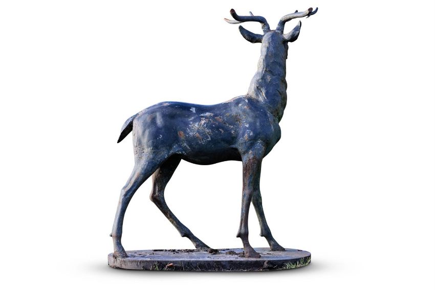 A PAINTED METAL FIGURE OF A STANDING STAG 20TH CENTURY approximately 130cm high, base 102cm wide Condition Report: Weathered and worn- losses and damages from real deer tackling it! Antlers now incomplete and repaired breaks to antlers, neck and further damages notably to front right leg. Paint work with losses throughoutCondition Report Disclaimer