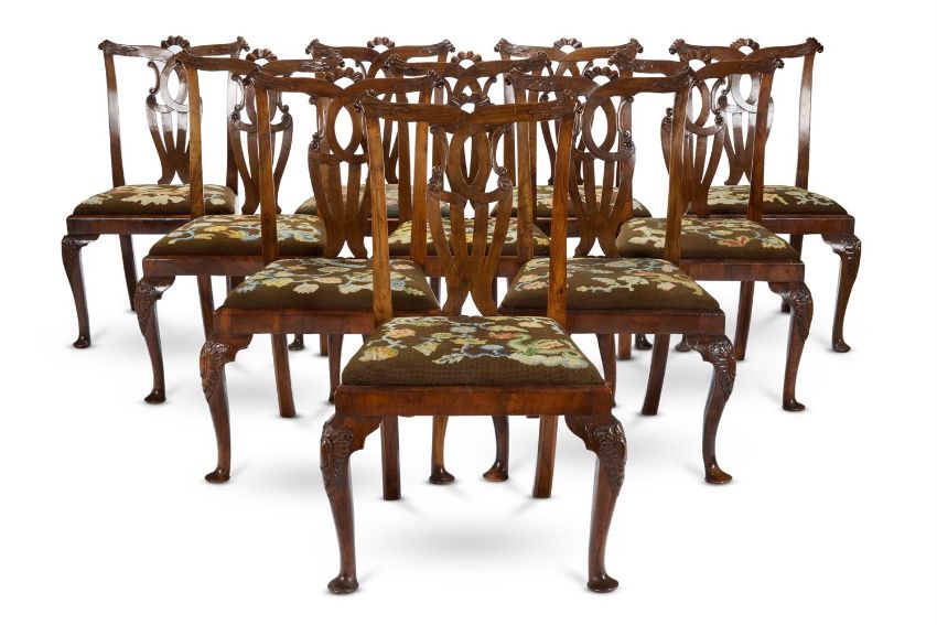 A SET OF TWELVE WALNUT DINING CHAIRS 19TH CENTURY Including two armchairs, each with a carved toprail, pierced interlaced splat and needlework drop-in seat on cabriole legs 97cm high, 62cm wide, 68cm deep Provenance: Probably purchased by Sir Ernest Salter Wills for the Dining Room at Littlecote House and thence by descent Condition Report: Generally good, structurally secure with wear and tear consistent with age and use. here are dents marks and scratches and shrinkage cracks. Some old repairs, for example to one toprail of an armchair. One side chair with a small loss to the edge moulding to the seat rails. Some old worm damage, notably to the legs, but there is no loss of strength or integrity. The needlework seat in good order.Condition Report Disclaimer