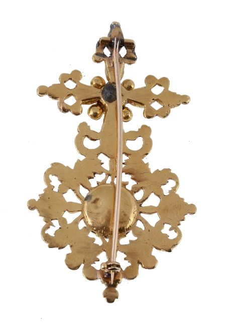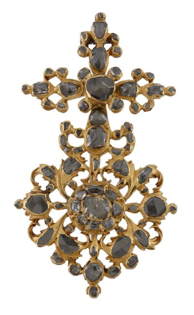 A late 17th century Iberian brooch , after 1680 the pierced rose cut diamond set panel in the form of a cross above a open foliate cluster, 6.6cm long, later brooch fitting