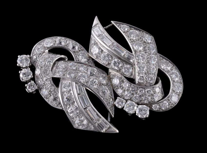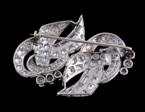 A 1950s diamond scroll brooch , the pierced scrolled panel set with brilliant and baguette cut diamonds, approximately 5.76 carats total, 4.2cm wide