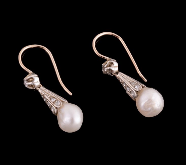 A pair of diamond and pearl earpendents, the pearls measuring approximately 7mm long from rose cut diamond surmounts, to a raised claw set rose cut diamond pediment, 2.5cm long Please note the pearls are untested and unwarranted as natural pearl