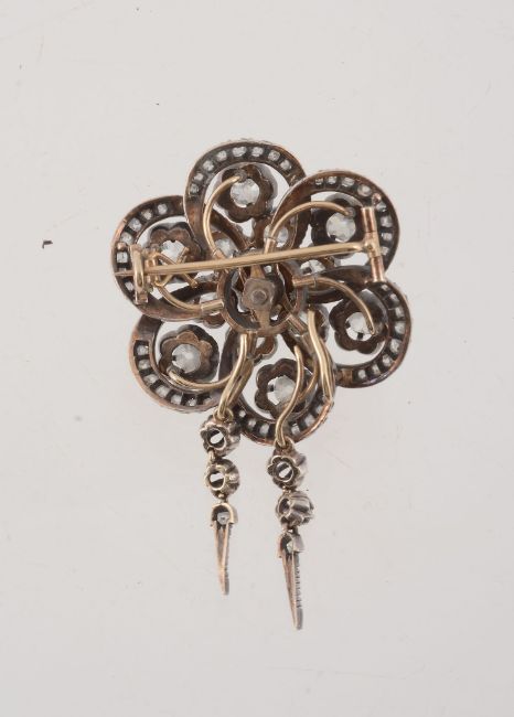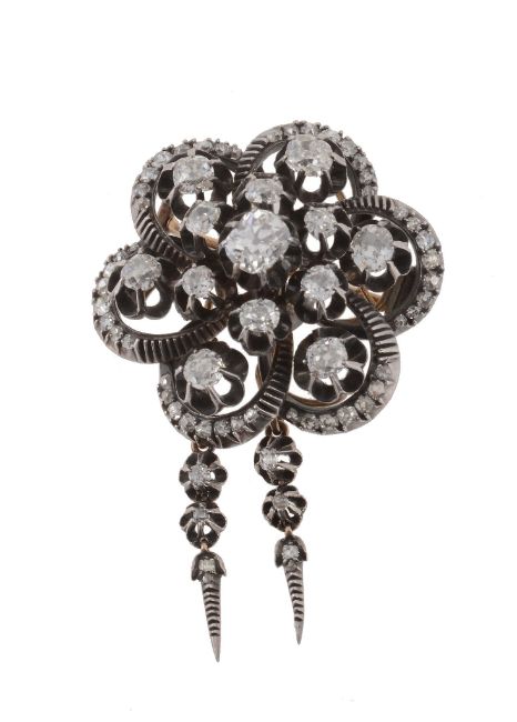 A 19th Century diamond target cluster brooch, circa 1880, the central oval old cut diamond claw set within a surround of similarly set old cut diamonds, to a scalloped border set with further old cut diamonds in pinched collet settings, suspending two old cut diamond set tassels, approximately 3.10 carats total, 6cm long