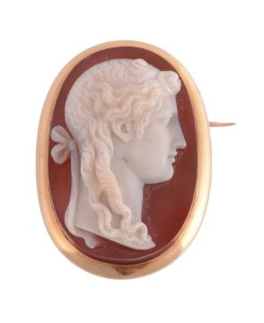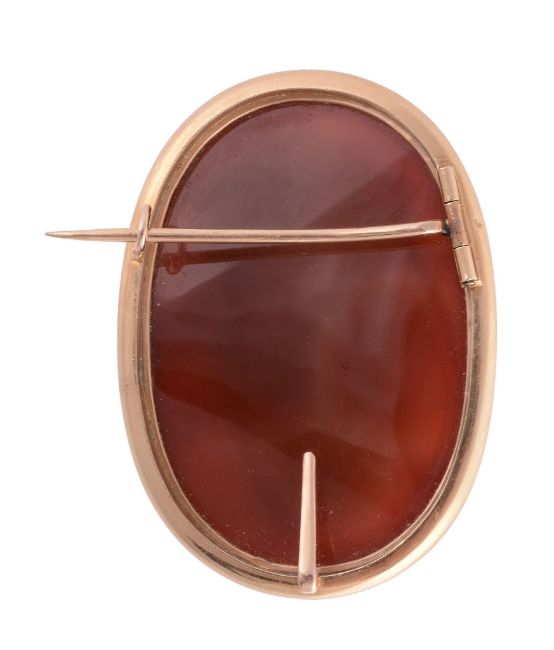 A hardstone cameo brooch, the oval hardstone cameo carved with a lady's profile, within a polished surround, 6cm long