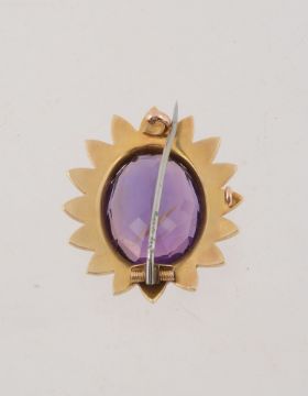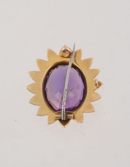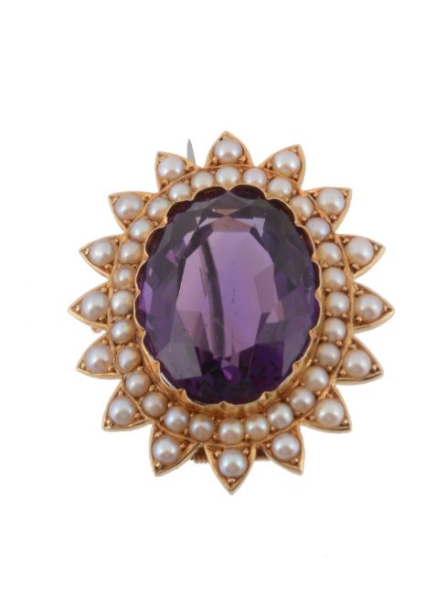 A Late Victorian amethyst and half pearl brooch, circa 1900, the central oval shaped amethyst in a pinched collet setting, within a surround of half pearls, 3.5cm wide