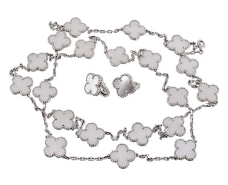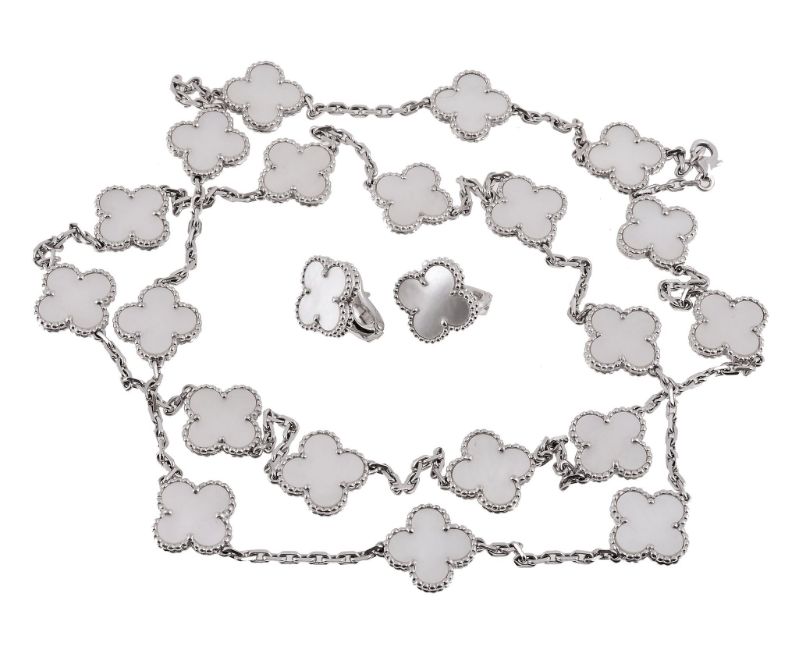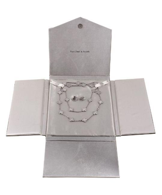 An Alhambra mother of pearl necklace and ear clips by Van Cleef & Arpels , the quatrefoil mother of pearl panels within a beaded surround, one stamped VCA and numbered BL152582, with facetted belcher link chain connectors between, the clasp with French poincon, 80cm long; the matching stud ear clips signed VCA and numbered JB107743; both items have Authenticity certificates, in a Van Cleef & Arpels case