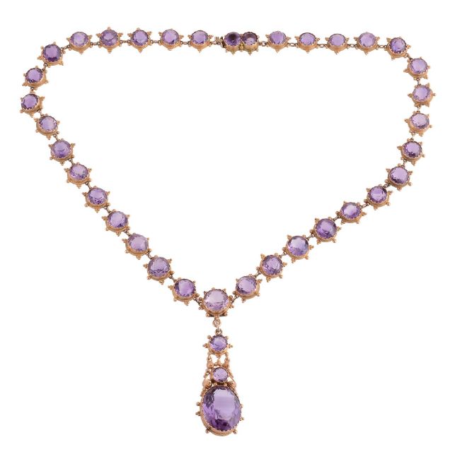 A Regency amethyst necklace, circa 1830, composed of graduating circular shaped amethysts within beaded surrounds, suspending an oval shaped amethyst drop, with a concealed box clasp, 42cm long