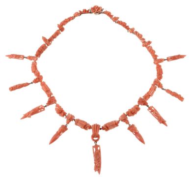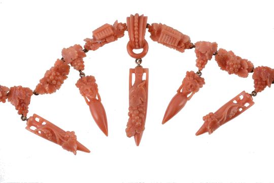 A 19th Century coral drop necklace, circa 1860, composed of coral links carved with fruiting vine leaves and pan flutes, suspending coral drops carved as amphorae with fruiting vines and amphorae topped with bacchante heads, to a concealed box clasp, 47.5cm long