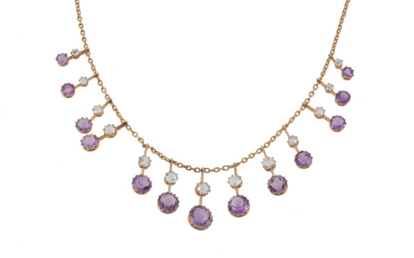 An Edwardian amethyst and aquamarine fringe necklace, circa 1910, the graduating knife edge bar drops with round cut amethyst terminals, and round cut aquamarines above, suspended from a belcher link chain, 43cm long