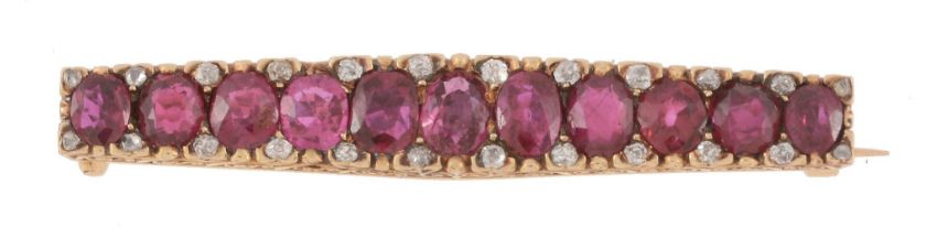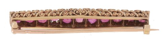 A late 19th century French ruby and diamond bar brooch, circa 1890, the tapered panel set with eleven graduated oval shaped rubies, with diamond points between, to a pierced scrolled gallery, stamped with French poincon, 4.4cm wide