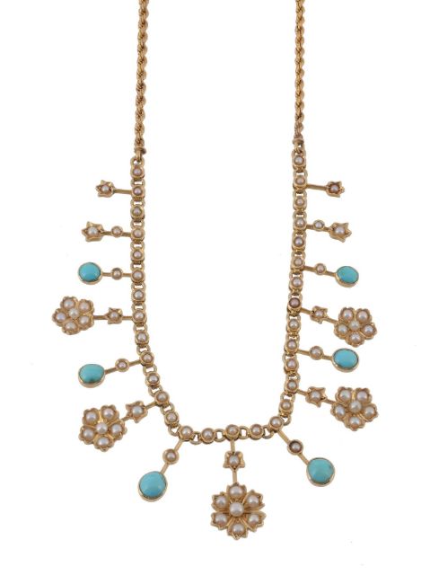 An Edwardian pearl and turquoise necklace, circa 1910, composed of flower head clusters set with pearls and half pearls, suspended from a half pearl set chain with cabochon turquoise in between, on a ropetwist neck chain, to a concealed barrel clasp, stamped 15ct, 47cm long